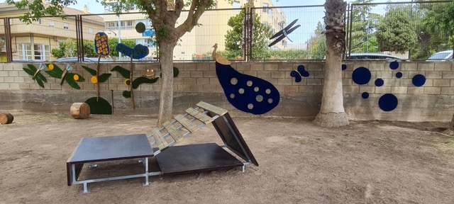 Entre palmeras es una intervención puntual en el patio de Educación Infantil que actúa con gestos sencillos y precisos sobre un espacio natural poco activado. La actuación incorpora una plataforma de juego pensada para favorecer el juego motriz, un cocodrilo de madera que funciona como elemento de encuentro y espacio de calma, y un mural artístico protagonizado por un pavo real y libélulas que introduce un universo imaginario en el patio.
