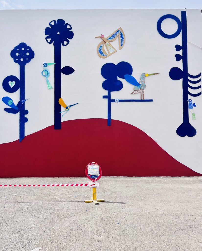 El mural urbano “El bosque azul” nace de la visión abierta y creativa de las hermanas Rosa Pilar y Amparo Ballester Valls, codirectoras de los centros de educación infantil Mini Cole en Valencia. Su firme apuesta por la metodología Montessori les impulsa a concebir un proyecto que trasciende las aulas: un mural que integra la filosofía educativa del centro en la trama urbana de Puçol.